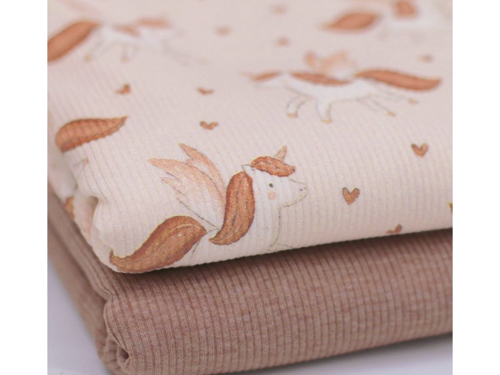 Žebrovaný úplet s potiskem Létající jednorožec je ideální volbou pro šití oblečení pro děti. Díky jemné žebrované struktuře je látka pružná, pohodlná a dobře se přizpůsobí pohybu. 👉 Skvěle zkombinujete s: