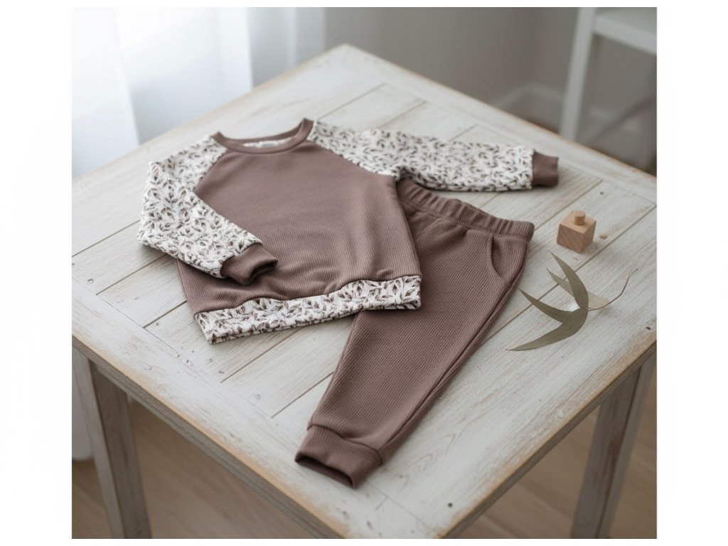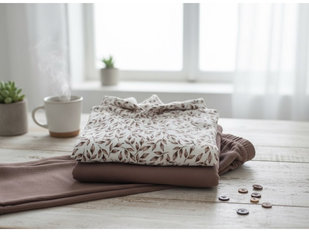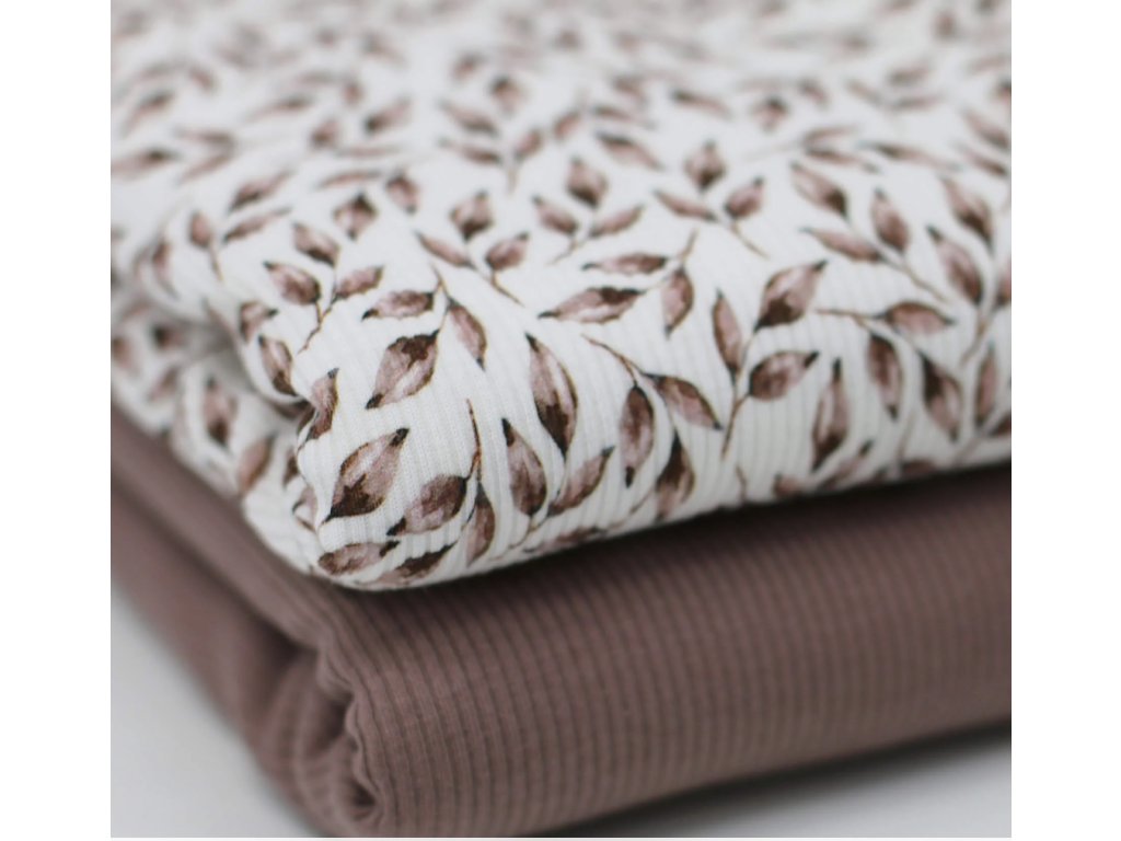 Jemný žebrovaný úplet s motivem lístků v mauve odstínech přináší do vašich šicích projektů eleganci a přírodní kouzlo. Materiál je pružný, měkký a pohodlný na nošení – ideální pro trička, šaty, legínky i dětské kousky.