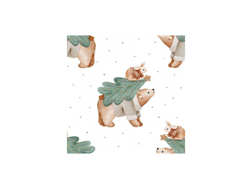 Žebrovaný úplet - Medvěd a vánoční stromeček je pružný a pohodlný materiál se žebrovanou strukturou, který pěkně přiléhá k tělu a zároveň drží tvar. Hodí se na trička, šaty, legíny, čepice a nákrčníky pro děti i dospělé. Díky směsi bavlny s elastanem je příjemný na dotek, prodyšný a snadný na údržbu – ideální pro každodenní nošení.