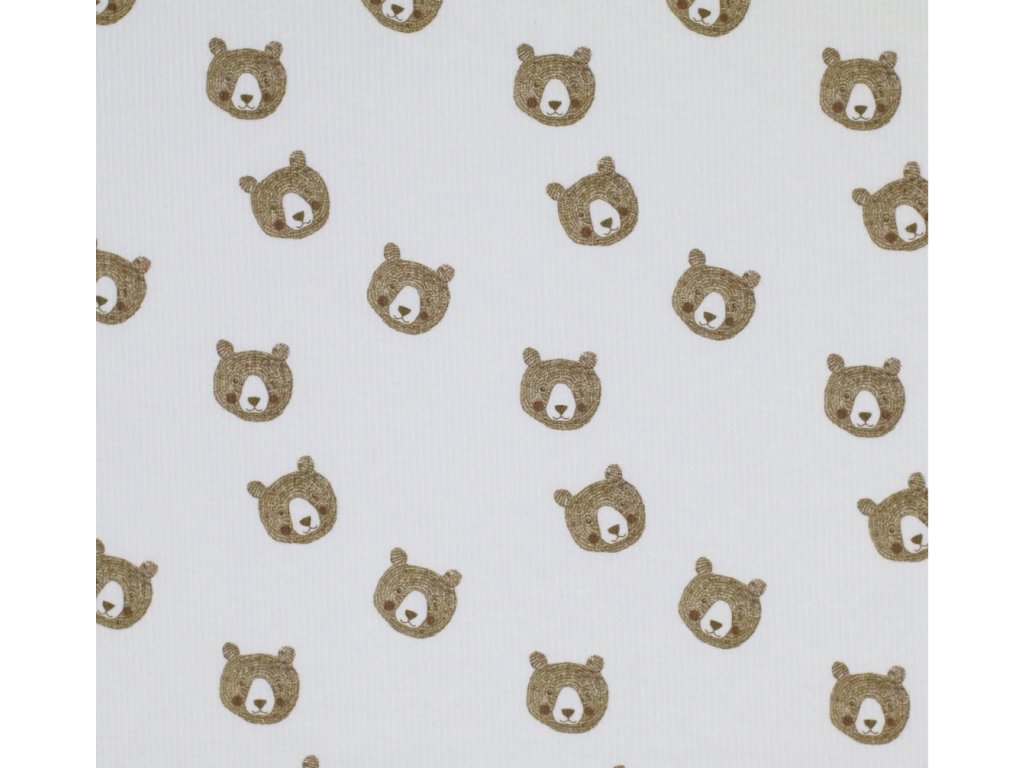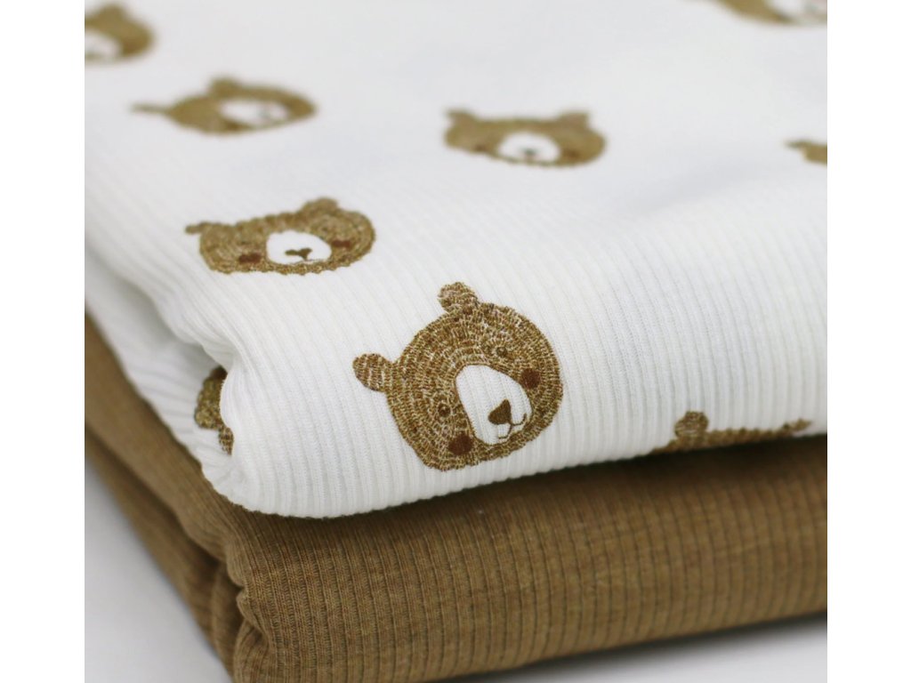 Žebrovaný úplet s potiskem medvědů je ideální volbou pro šití oblečení pro děti. Díky jemné žebrované struktuře je látka pružná, pohodlná a dobře se přizpůsobí pohybu.