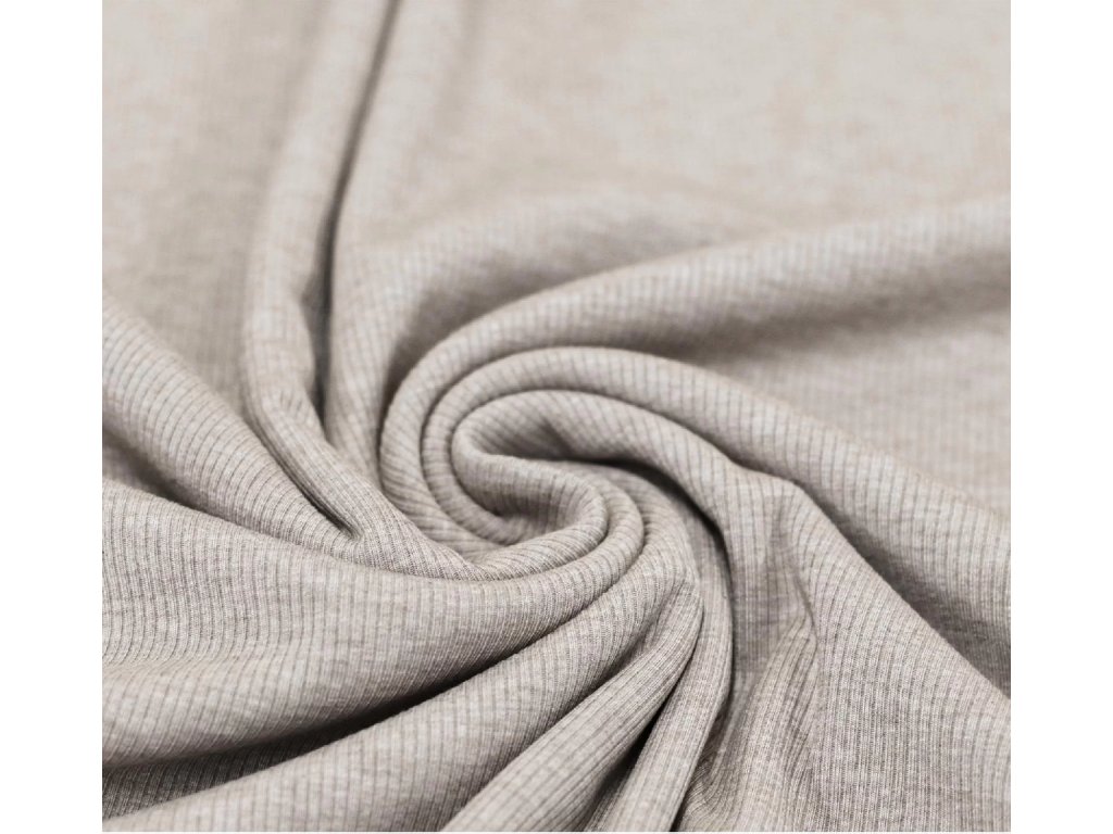 Žebrovaný úplet - Melange Béžová je pružný a pohodlný materiál se žebrovanou strukturou, který pěkně přiléhá k tělu a zároveň drží tvar. Hodí se na trička, šaty, legíny, čepice a nákrčníky pro děti i dospělé. Díky směsi bavlny s elastanem je příjemný na dotek, prodyšný a snadný na údržbu – ideální pro každodenní nošení.