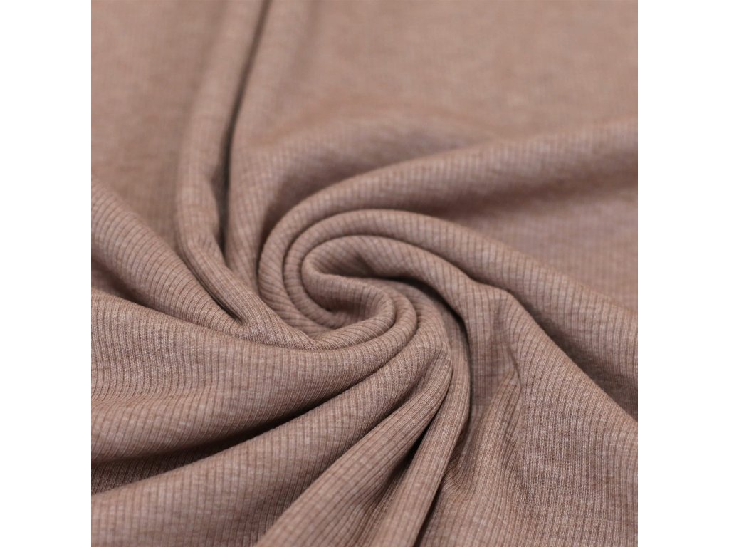 Žebrovaný úplet - Melange Kakao je pružný a pohodlný materiál se žebrovanou strukturou, který pěkně přiléhá k tělu a zároveň drží tvar. Hodí se na trička, šaty, legíny, čepice a nákrčníky pro děti i dospělé. Díky směsi bavlny s elastanem je příjemný na dotek, prodyšný a snadný na údržbu – ideální pro každodenní nošení.