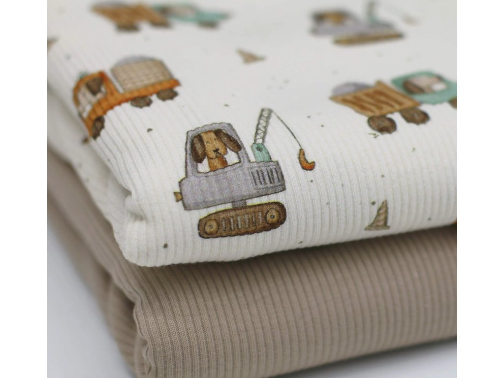 Žebrovaný úplet s potiskem Pejsek stavitel je ideální volbou pro šití oblečení pro děti. Díky jemné žebrované struktuře je látka pružná, pohodlná a dobře se přizpůsobí pohybu. 👉 Skvěle zkombinujete s: