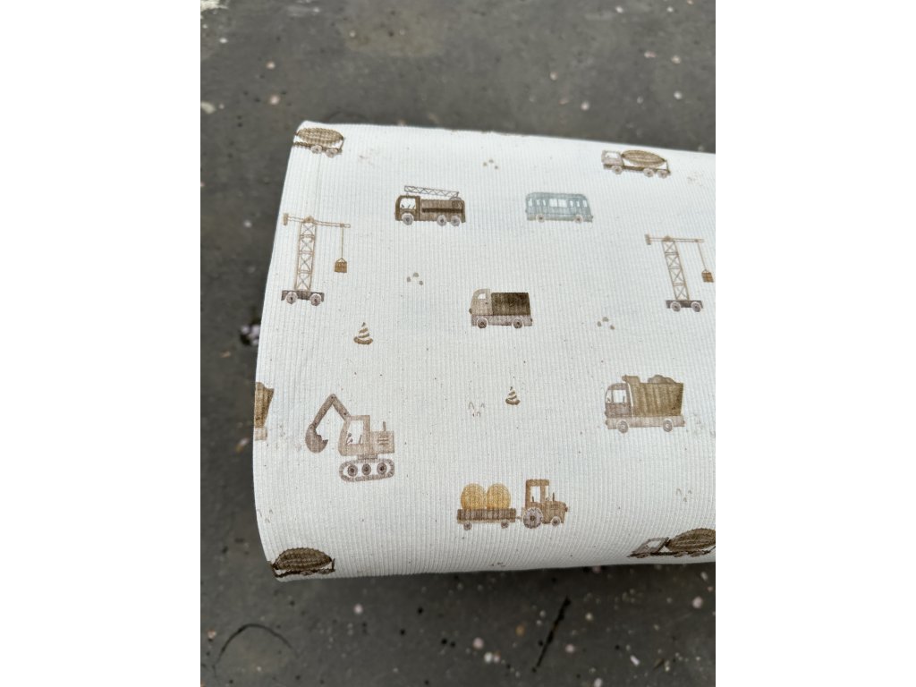 Žebrovaný úplet - Stavební stroje je pružný a pohodlný materiál se žebrovanou strukturou, který pěkně přiléhá k tělu a zároveň drží tvar. Hodí se na trička, šaty, legíny, čepice a nákrčníky pro děti i dospělé. Díky směsi bavlny s elastanem je příjemný na dotek, prodyšný a snadný na údržbu – ideální pro každodenní nošení.