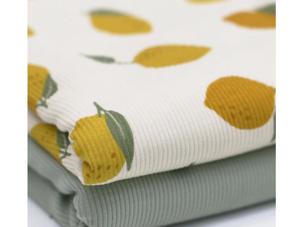 Žebrovaný úplet - Větší citróny je pružný a pohodlný materiál se žebrovanou strukturou, který pěkně přiléhá k tělu a zároveň drží tvar. Hodí se na trička, šaty, legíny, čepice a nákrčníky pro děti i dospělé. Díky směsi bavlny s elastanem je příjemný na dotek, prodyšný a snadný na údržbu – ideální pro každodenní nošení.
