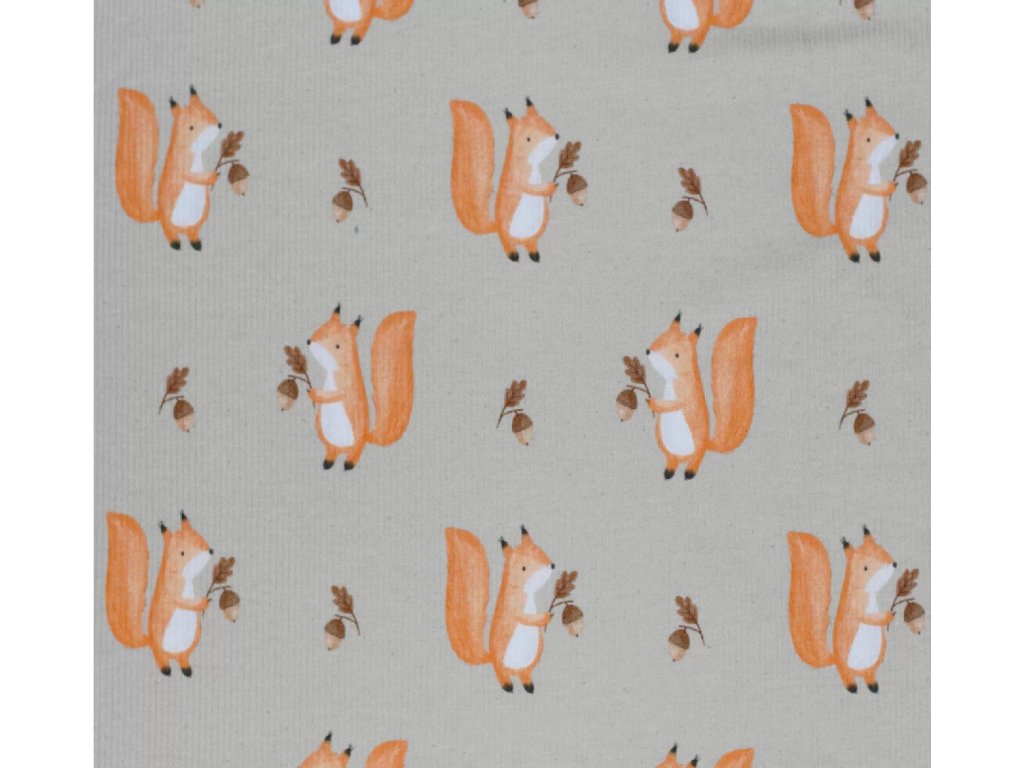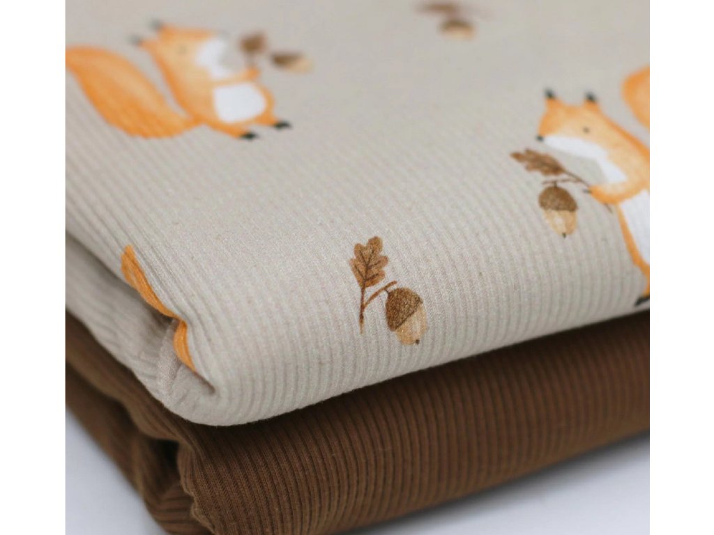 Žebrovaný úplet - Veverky s ořechy je pružný a pohodlný materiál se žebrovanou strukturou, který pěkně přiléhá k tělu a zároveň drží tvar. Hodí se na trička, šaty, legíny, čepice a nákrčníky pro děti i dospělé. Díky směsi bavlny s elastanem je příjemný na dotek, prodyšný a snadný na údržbu – ideální pro každodenní nošení.