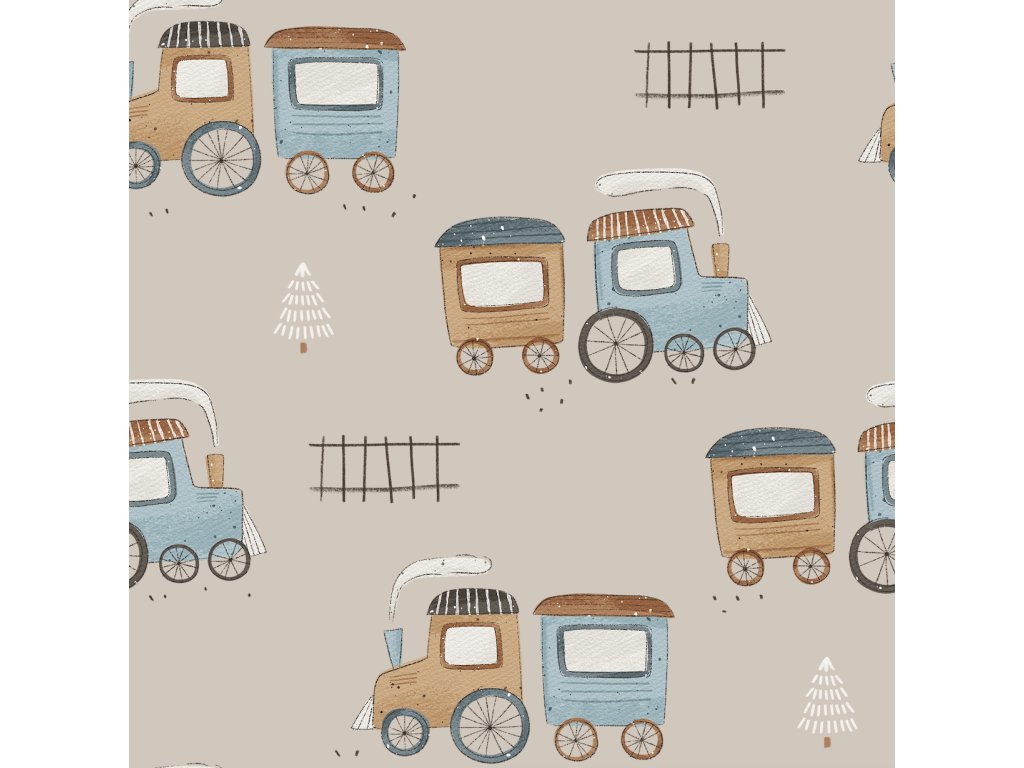 Žebrovaný úplet - Vláčky na taupe je pružný a pohodlný materiál se žebrovanou strukturou, který pěkně přiléhá k tělu a zároveň drží tvar. Hodí se na trička, šaty, legíny, čepice a nákrčníky pro děti i dospělé. Díky směsi bavlny s elastanem je příjemný na dotek, prodyšný a snadný na údržbu – ideální pro každodenní nošení.