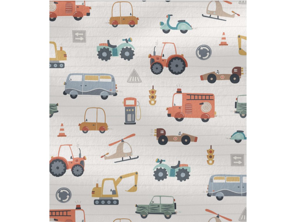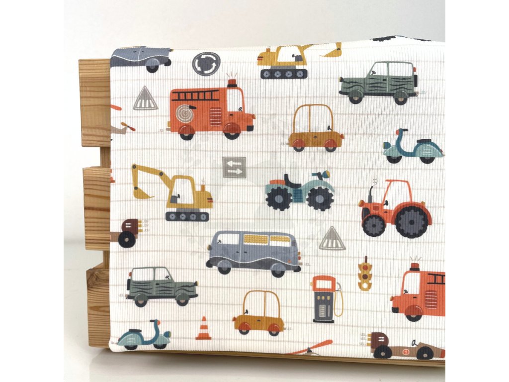Žebrovaný úplet - Vozový park je příjemná a pružná látka vhodná na trička, šaty i dětské oblečení. Snadno se kombinuje s dalšími materiály a dobře drží tvar.