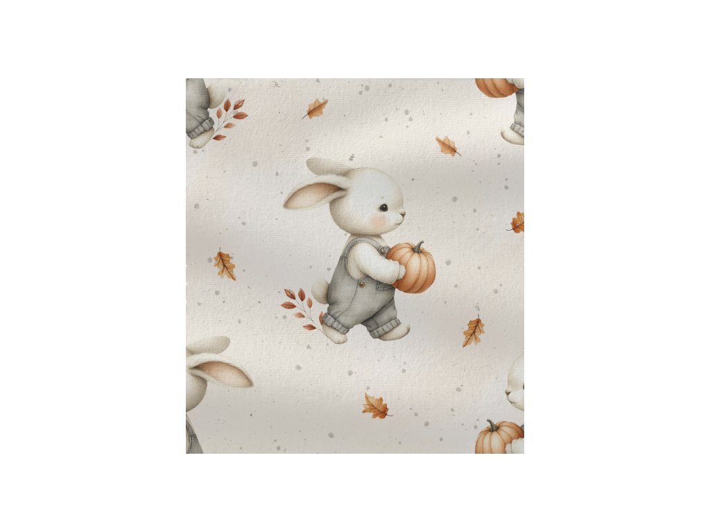 Jemně žebrovaný úplet s roztomilým motivem zajíčků a dýní přinese do tvého šití podzimní kouzlo. 🐇🎃🍂 Díky žebrové struktuře je pružný, pohodlný a ideální jak na oblečení, tak na lemy. Snadno se šije a potěší začátečnice i zkušené švadlenky. ✂️