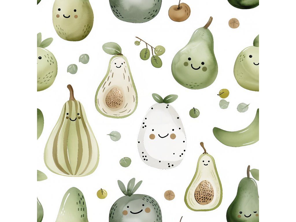 Potisk roztomilých zelených figurek s hravými výrazy působí vesele a neotřele. Látku lze snadno kombinovat s jednobarevnými úplety v odstínech zelené, bílé či černé pro výrazný a moderní vzhled.