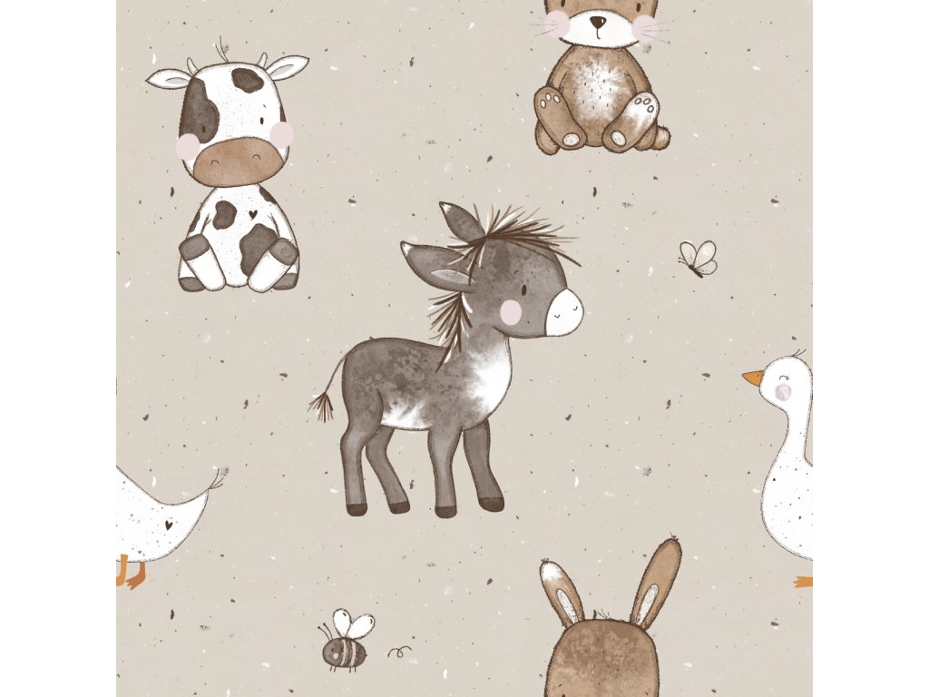 Potisk s kravičkami, ovečkami, prasátky a dalšími zvířátky v jemném barevném provedení na taupe podkladu působí mile a vkusně. Látku snadno zkombinujete s jednobarevnými úplety v přírodních nebo pastelových tónech pro harmonický vzhled.